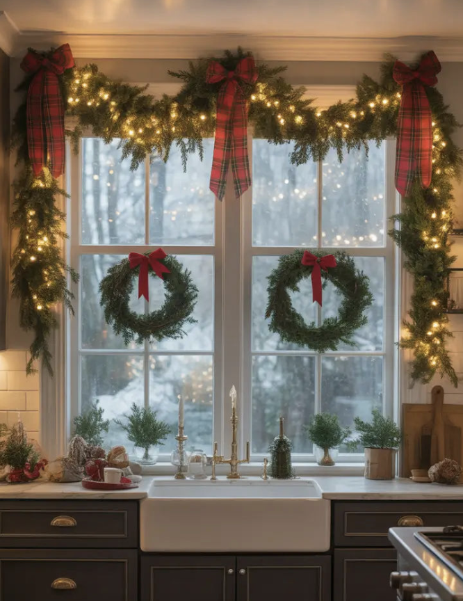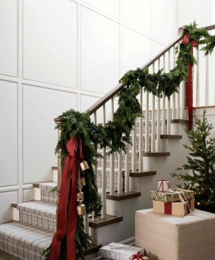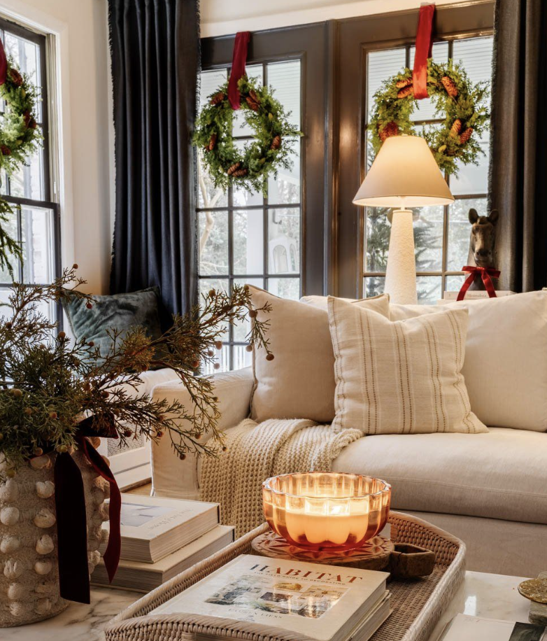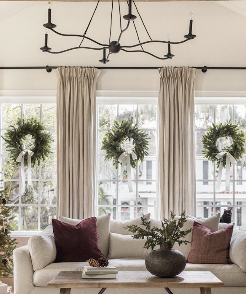 The past few years we’ve hung wreaths in our dining room windows and it has become my favorite little touch. I plan to go with a bolder bow ribbon this year. I always get questions on how to hang them. We put tiny nails above the window trim that we leave up all year and string a ribbon from above. A command hook right on the glass would also do the trick.
