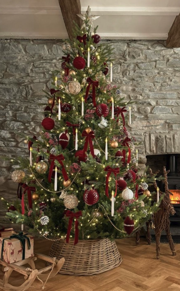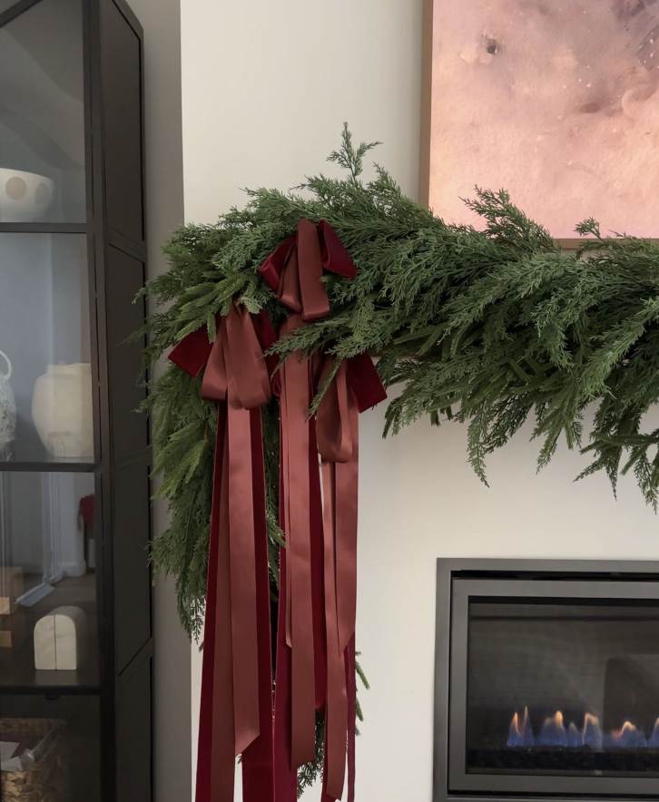 Growing up, my mom always put giant bows all over our Christmas tree. That trend has come right back around the past few years, and I’m SO here for it. I ordered some burgundy colored ribbon to layer different sizes on wreaths, garland and the tree.